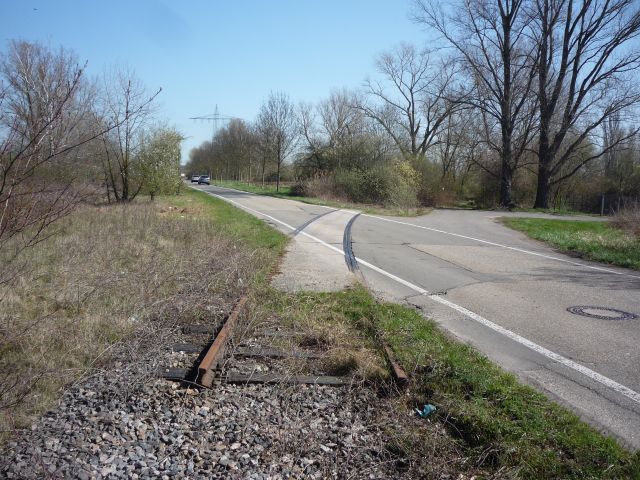 Zunächst wird die Straße vom Industriegebiet nach Landau überquert. Hier biegt die Strecke in einer 90°-Kurve